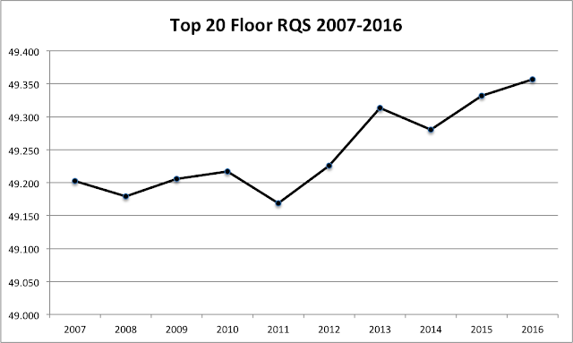 We're closing in on an average top-team floor RQS two tenths higher than it was in 2011, and it's not like the floor workers are any better now than they were in 2011. The scores are simply looser and considerably higher than they are on any other event. I fully expect to see a flurry of 49.5s on floor at nationals this year, so teams cannot afford to let that scoring opportunity slip away, even with a 49.3. There's too much to be gained on floor, and because of that, it becomes the most important event to be good at. It's how Florida won last year (49.650 to Utah's 49.425), and it's how Oklahoma fell out of Super Six because the OOBs from Dowell and Jackson meant the Sooners could not take advantage of the sea of gold pieces ready to be showered upon them on floor.